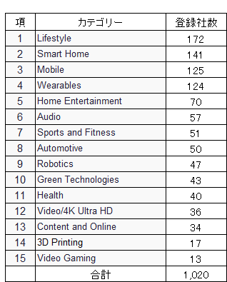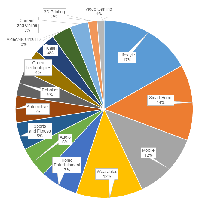 複数カテゴリーに登録している企業もいるであろうが、平均すると2.5カテゴリーに登録しているのではと思われる。 例えば、自社製品のカテゴリとして、MobileとWearable の二つに登録するということである。 このカテゴリーをパイチャートで見ると、以下のようになる。 Lifestyle、Smart Home、MobileとWearableで過半になっている。登録カテゴリーの重複もあるであろうが、このカテゴリーの企業が多いのであろうと思われる。 その意味で、デジタルガジェット系の製品が多いのであろうと思われる。