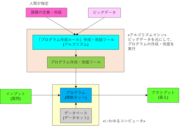 このように考えると (私の定義からすると)、AIとはアルゴリズムマシンとした方が、より正確と考えられる。 むろん、時には、アルゴリズムマシンと計算実行マシン (コンピュータ)が合体した 機械もあるであろうが。