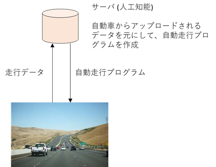 上位のサーバは、各車から走行データをアップロードしてもらい、その走行データを 基にして、自動走行のプログラムを改版し、そのプログラムを自動車にダウンロード している。